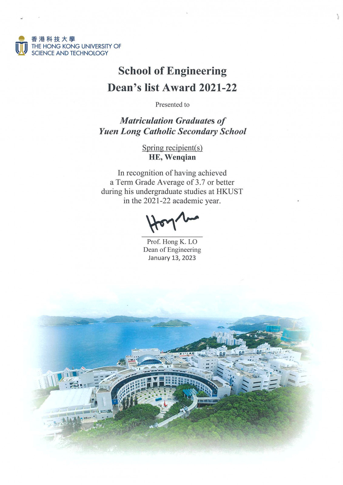 恭賀校友何文謙榮獲香港科技大學工程學院長嘉許名單2021-2022